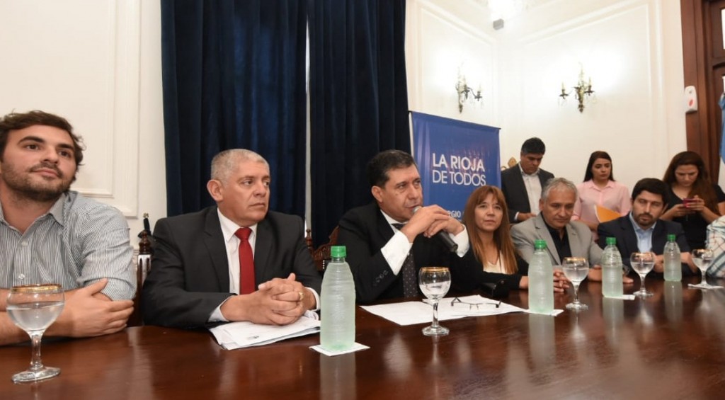 El gobernador Sergio Casas, junto al ministro de Desarrollo Social Juan Carlos Santander y el gerente general del Banco Rioja, Federico Bazán, realizaron el anuncio de la bancarización del pago de la mayoría de los programas sociales que corresponden a la cartera social de la provincia.