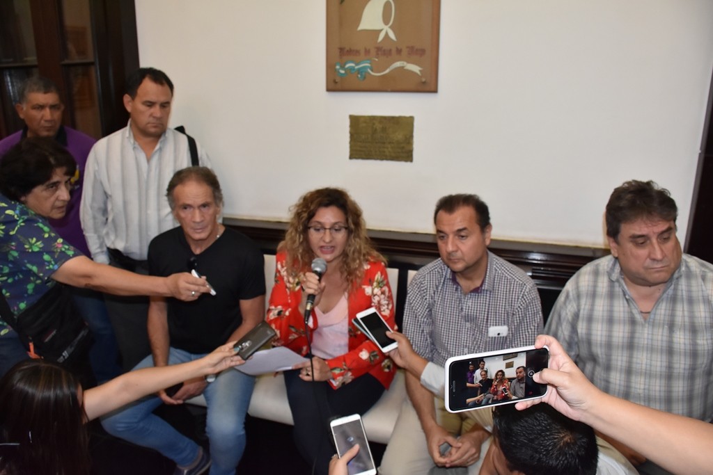 La diputada provincial, Sonia Torres junto a referentes del espacio Encuentro por La Rioja y los representantes sindicales Del Giorno y Laciar presentaron el proyecto de ley que exige al Ejecutivo Provincial incorporar de forma permanente el bono de fin de año fijado para los empleados públicos de planta, al salario a partir de febrero de 2019.