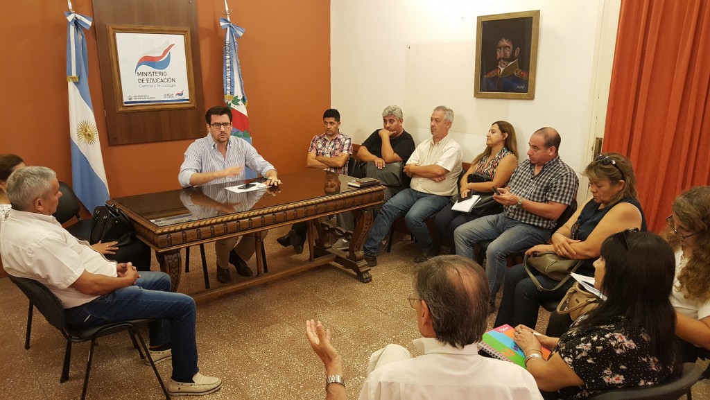 El ministro de Educación Juan Luna Corzo, presentó a los referentes Rogelio De Leonardi (AMP), María José Vera (UDA), Carlos Millicay (AMET), Ignacio Colina (SELAR) y otros dirigentes gremiales presentes, la propuesta de aumento salarial del Gobierno Provincial.