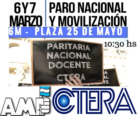 La movilización por Paritaria Nacional fue decidida por AMP en el Primer IV Intermedio de la 210° Asamblea Provincial. Además resolvió, promover y adherir al paro nacional docentes declarado por CTERA los días 06 y 07 de Marzo sin asistencia a los lugares de trabajo.Por otro lado, se determinó participar de la movilización del día 06 de marzo, a Plaza de Mayo (CABA), por temas como la convocatoria a la Paritaria Nacional Docente, paritarias libres y sin techo, aumento del fnanciamiento educativo, condiciones dignas para enseñar y aprender, escuelas seguras, infraestructura, becas. Además aumento de la cuota para comedores y copa de lechem la defensa del sistema previsional, oposición a la Reforma Laboral y en contra el congelamiento y ajuste en el sistema de Becas Progresar.