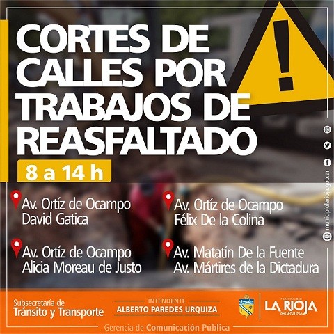 La Municipalidad de la Rioja a través de la Dirección de Conservación Vial, comunica que a partir del 7 de Marzo se realizarán cortes por reasfaltado en avenida Ortiz de Ocampo en las intersecciones con calles David Gatica, Felix de la Colina y Alicia Moreau de Justo; además en avenidas Matatin de la Fuente y Mártires de la Dictadura desde las 08 a 14 horas.