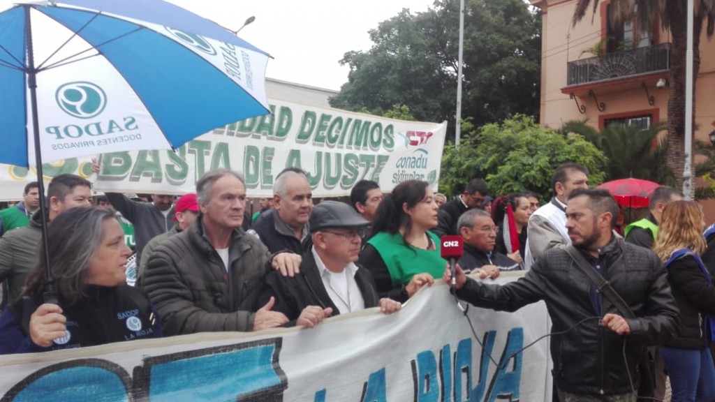 Como ya estaba previsto, en la mañana de este martes, la plaza 25 de mayo de la capital riojana se convirtió en el lugar elegido por distintos sectores sindicales para llevar adelante una marcha en contra de las políticas de ajuste que mantiene el gobierno nacional contra los trabajadores.