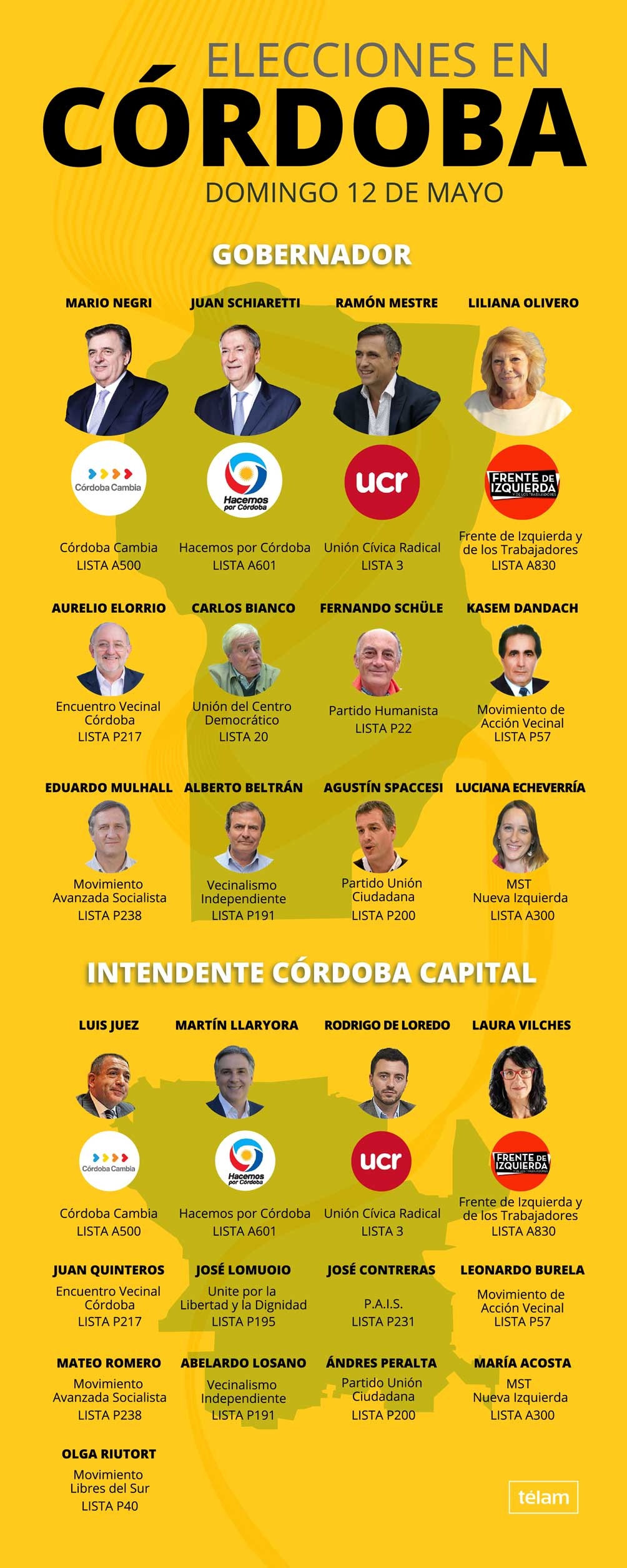 Los cordobeses votarán gobernador y vicegobernador, 70 legisladores locales, intendentes y los tres tribunos de cuentas.