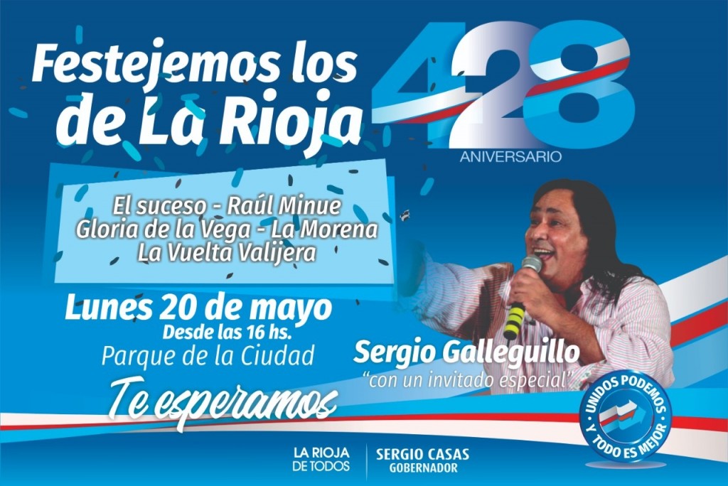El gobierno dio a conocer el programa de celebración del 428° aniversario de La Rioja que incluye el acto central con el tradicional desfile cívico militar el próximo lunes 20 de mayo a las 9,30 en el Parque de la Ciudad, que será encabezado por el gobernador Sergio Casas.