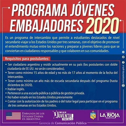 La Municipalidad de La Rioja, a través de la Dirección de Juventud de la zona Norte y la Embajada de los Estados Unidos en Argentina, informan que se encuentra abierta la convocatoria al programa “Jóvenes Embajadores 2020”.