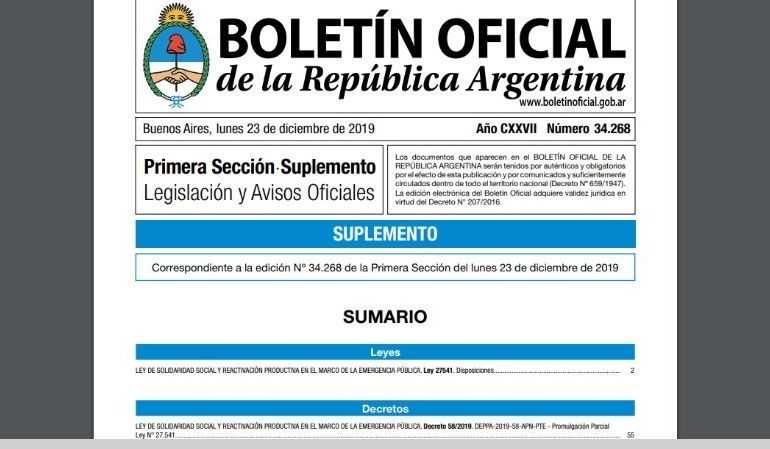 El gobierno nacional publicó finalmente este lunes la ley de Solidaridad Social y Reactivación Productiva en el Boletín Oficial, sancionada el sábado por el Congreso, por lo que ya comenzaron a regir sus cambios en materia financiera, previsional, tarifaria, energética, sanitaria e impositiva, entre otras modificaciones en el marco de la Emergencia Pública.