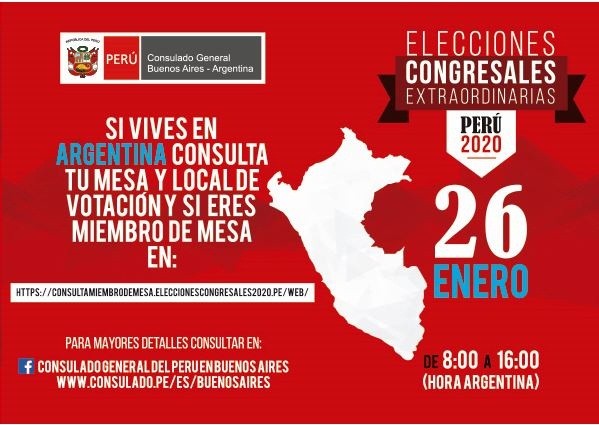 Este domingo 26 de enero de 8.00 a 16.00 los residentes peruanos podrán votar sus congresales en el CePar Oeste (Av. Yacampis esquina Nación Argentina).