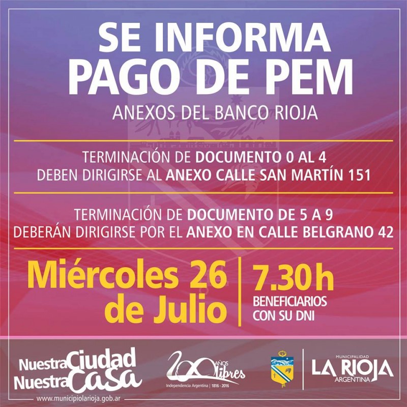 La Municipalidad de La Rioja a través de la Secretaría de Hacienda comunica a los beneficiarios del Programa de Empleo Municipal (PEM) que este miércoles inicia el pago de haberes, sin embargo se informa que los trabajadores que ya poseen su tarjeta de débito, podrán acercarse a cobrar por cajero automático en la tarde del martes 25.