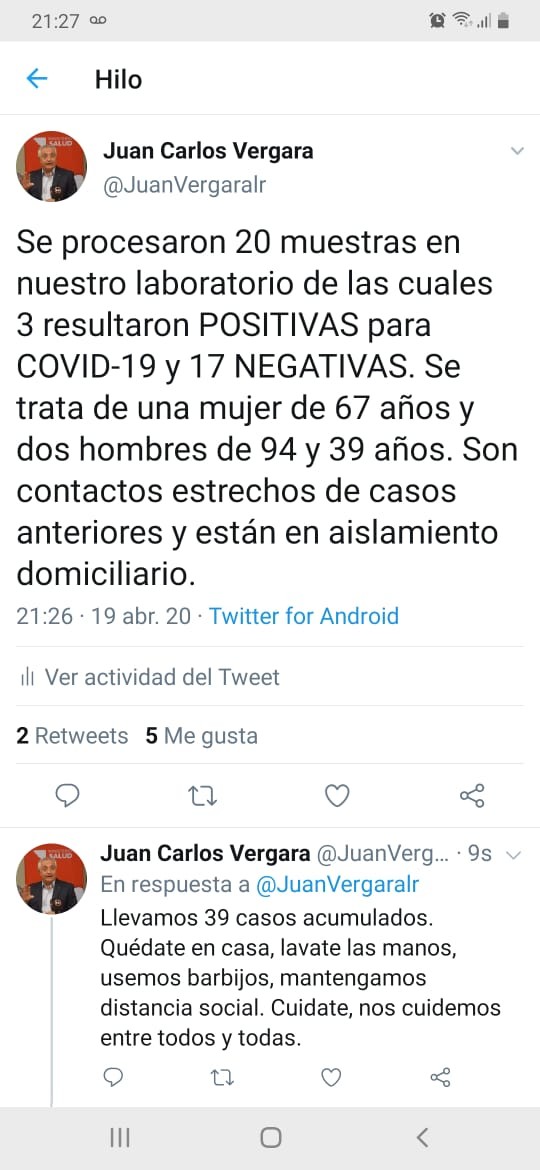 El ministro de Salud, Juan Carlos Vergara, informó que se detectaron 3 nuevos casos de coronavirus y se tratan de una mujer de 67 años, y dos hombres de 94 y 39 años respectivamente. Los nuevos pacientes diagnosticados permanecen en aislamiento domiciliario.