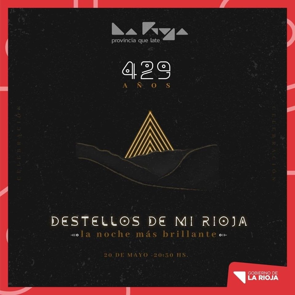 Bajo el lema “Destellos de mi Rioja”,el Gobierno provincial ,en estos 429 años de su fundación propone una celebración distinta en tiempos de cuarentena e invita a los riojanos a participar este miércoles 20 de mayo a partir de las 20.30 de este espectáculo que podrá ser observado desde cualquier punto de la ciudad.