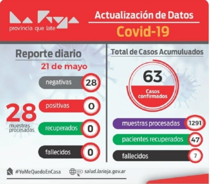 En el informe diario que brinda el gobierno de La Rioja, detalla que este jueves cierra sin nuevos casos de coronavirus en la provincia y que de todas las muestras efectuadas desde que comenzó la pandemia (1291), solo 63 dieron positivas lo que marca menos del 5% del total de las determinaciones.