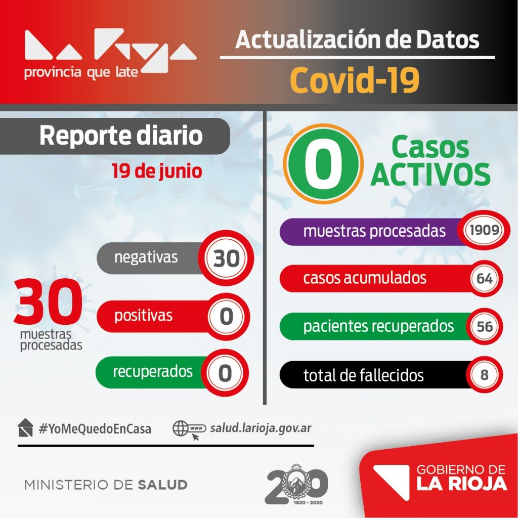 El gobierno provincial informó que este viernes se procesaron 30 muestras y todas resultaron negativas para COVID-19. Desde el inicio de la pandemia se tomaron un total de 1.909 muestras y hay 64 casos confirmados de coronavirus, con 56 personas recuperadas, 8 fallecimientos y 0 casos activos. Se cumplen 13 días sin reportar nuevos contagios en la provincia.