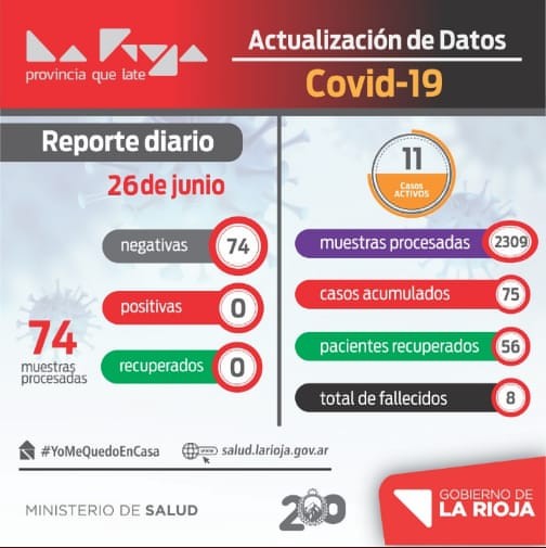 Este viernes, se procesaron 74 muestras, resultando todas negativas para COVID-19. De esta manera La Rioja tiene 75 casos acumulados, de los cuales 56 se recuperaron, hay 8 fallecidos, hay 11 casos activos en toda la provincia.