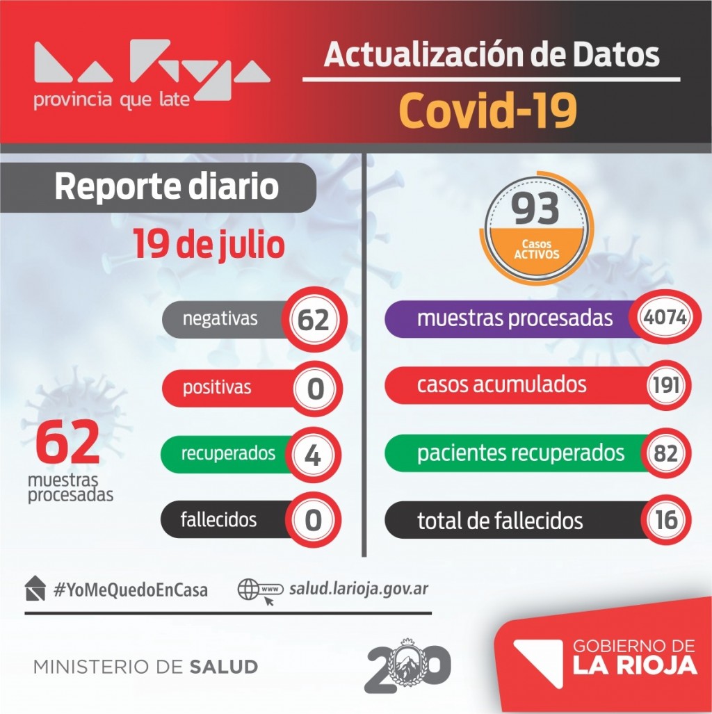 El reporte provincial indica que se procesaron 62 muestras y todas resultaron negativas, con lo cual La Rioja tiene 93 casos activos, 83 personas recuperadas y 16 fallecimientos desde que comenzó la pandemia.