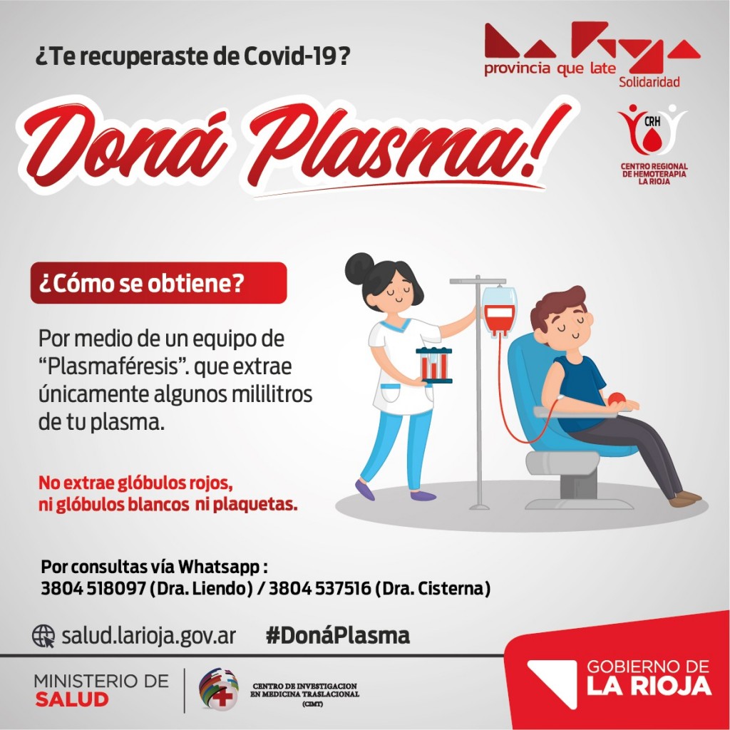 Si te recuperaste de coronavirus podes llamar a los tel 3804518097 o 3804537516 o dirigirte al Centro Regional de Hemoterapia ubicado en el Hospital Enrique Vera Barros