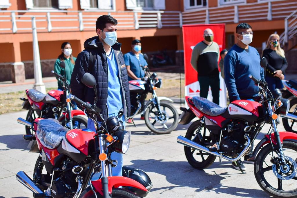 Se trata de 8 motos marca Cerro 125cc aportadas por el Banco Rioja junto a la Cámara de Diputados de la Provincia, para agentes sanitarios de los CAPS Virgen de los Cerros, Faldeo del Velazco, Eva Perón, Nancy Gallegos, 20 de Mayo, San Vicente, y la Supervisión de Agentes Sanitarios.