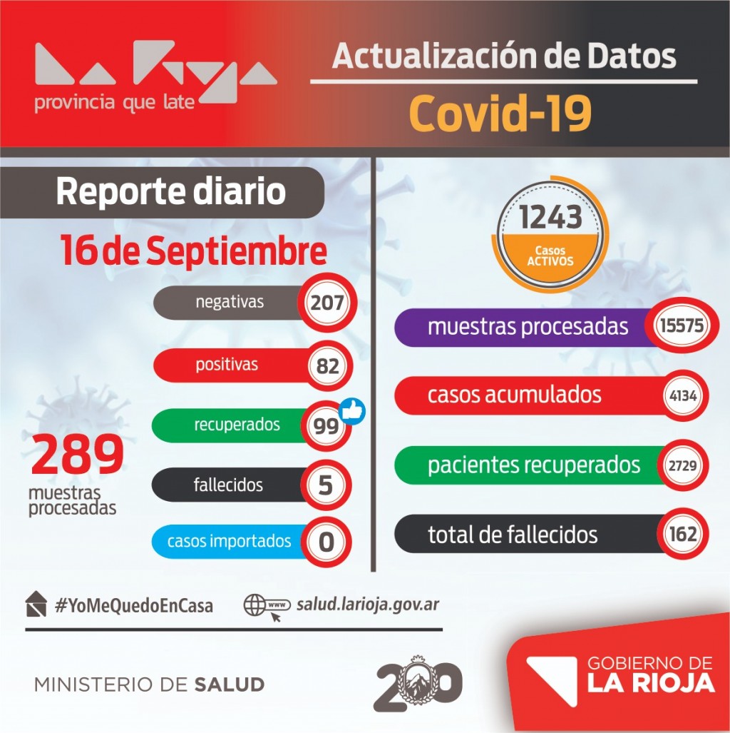 En estos momentos tenemos 4134 casos acumulados, hoy se recuperaron 99 personas, haciendo un total de 2729 recuperados, tenemos 1243 casos activos y 162 fallecidos.