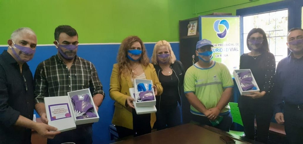 Este viernes la diputada provincial, Sonia Torres, acompañada por la Asociación Riojana de Sordos (ARSO), la delegación local del INADI y el Colectivo de la Inclusión, realizó la entrega de una partida de tapabocas transparentes destinados a la Subsecretaría de Seguridad Vial para que se incorporen a la atención el público y a los puestos de control en el marco de cumplimiento de la Ley N° 10.251.
