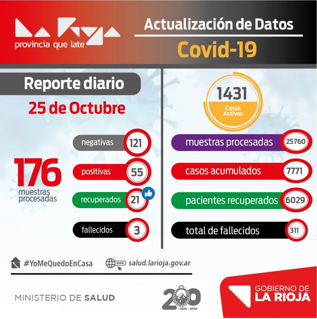 Asimismo se informaron 3 fallecimientos, con lo que ya son 311 los fallecidos en La Rioja, desde que se inició la pandemia.