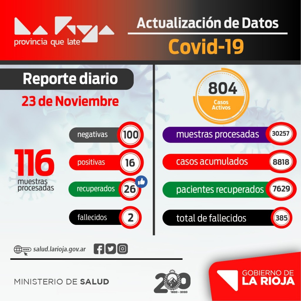 El informe diario, indica que "en nuestra provincia estamos atravesando el día 241 de la pandemia, con un total de 30257 muestras. En estos momentos tenemos 8818 casos acumulados, hoy se recuperaron 26 personas, haciendo un total de 7629 recuperados, tenemos 804 casos activos y 385 fallecidos".
