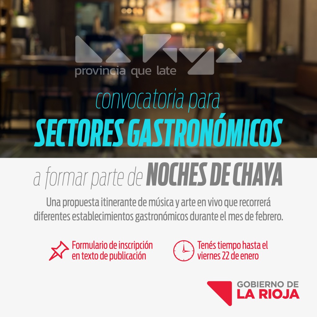En el marco de “Provincia que late Chaya”, el gobierno provincial convoca a los sectores gastronómicos, que posean un lugar físico al aire libre de atención al público, a sumarse a “Noches de Chayas”, una propuesta itinerante de música y arte en vivo que recorrerá diferentes establecimientos del rubro para mantener latiendo nuestro espíritu chayero durante el mes de febrero.