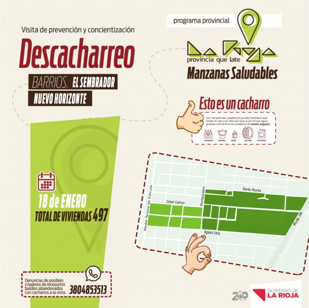 El programa del gobierno provincial, Manzanas Saludables comenzó este lunes 18, sus tareas de prevención, desmalezamiento y descacharreo en los barrios El Sembrador y Nuevo Horizonte, a fin de evitar la proliferación del mosquito aedes aegypti transmisor del Dengue. Se prevé abordar un total de 497 lotes.