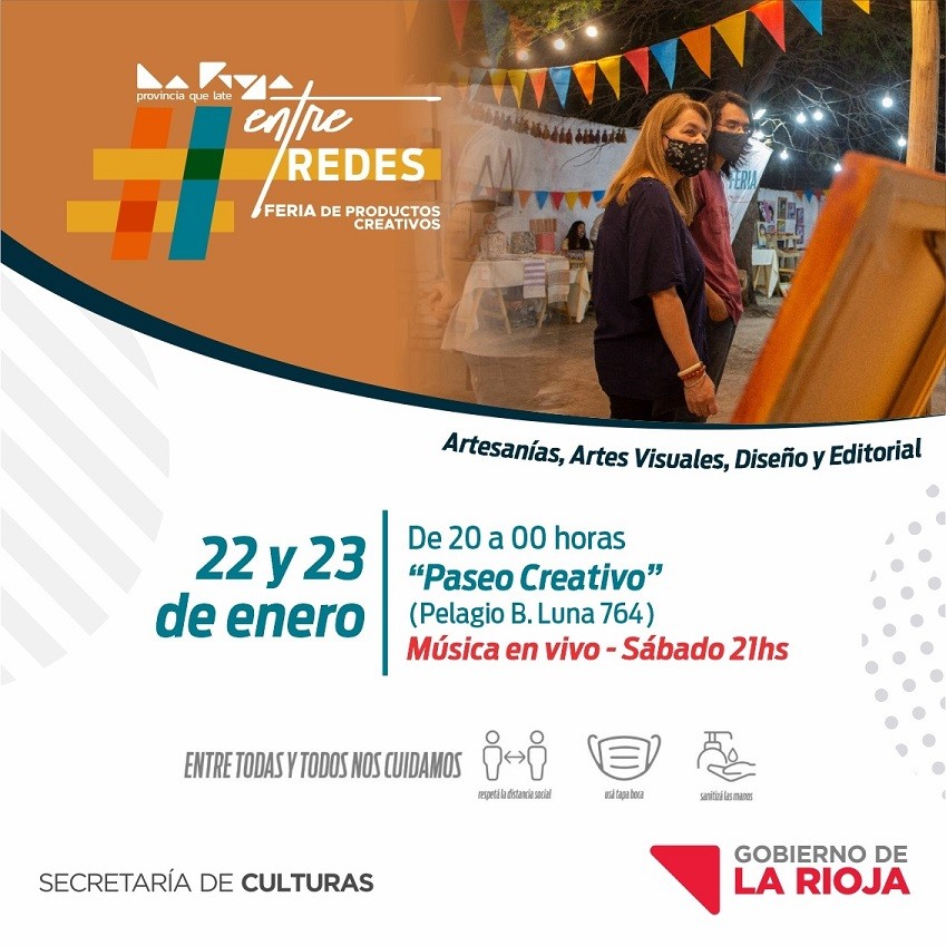 La feria "Entre Redes" de artesanías, artes visuales, diseño y editorial se realizará los días 22 y 23 de enero de 20 a 00 horas en el "Paseo Creativo" (Pelagio B. Luna 764). Contará con la participación de diferentes hacedores culturales de la provincia que estarán exponiendo y vendiendo sus producciones durante los dos días. Asímismo, durante la jornada del sábado 23 participarán músicos en vivo.