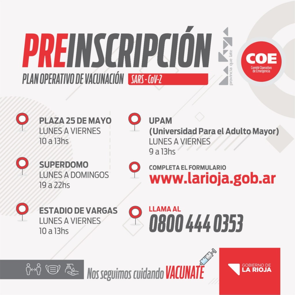 Las preinscripciones se llevan a cabo a través de la página www.larioja.gob.ar completando el formulario digital; telefónicamente llamando al 0800-444-0353 -donde también se podrán realizar consultas y evacuar dudas- o de forma presencial en el Estadio Carlos Augusto Mercado Luna en el barrio de Vargas y la Plaza 25 de Mayo de lunes a viernes de 10 a 13 horas, mientras que en el Superdomo podrán hacerlo de lunes a domingos de 19 a 22 horas.