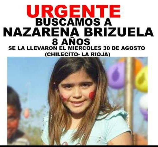 El vecino de Osvaldo Brizuela, padre de Nazarena, manifestó que "todo indica que la menor está con su madre, porque las propias hermanas de Oyola suben fotos en las redes sociales". Argañaraz comentó que "Nazarena está en estos momentos en manos de personas que se dedican a la trata de personas, a la prostitución y todos lo saben".
