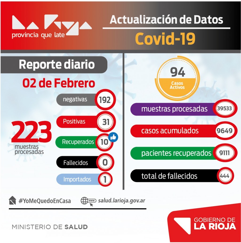 El informe oficial indica que "en nuestra provincia estamos atravesando el día 313 de la pandemia, con un total de 39.533 muestras. Tenemos 9649 casos acumulados, hoy se recuperaron 10 personas, haciendo un total de 9111 recuperados, tenemos 94 casos activos y 444 fallecidos".