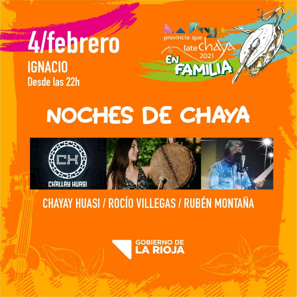 En el marco de “Provincia que late Chaya en Familia”, a través del Ministerio de Turismo y Culturas y la Secretaría de Culturas, en conjunto con la Secretaría de Industria MiPyMes y Comercio, invita a sumarse a “Noches de Chayas”, una propuesta itinerante de música y arte en vivo que recorrerá diferentes establecimientos gastronómicos para mantener vivo y latiendo nuestro espíritu chayero durante el mes de febrero, con todas las condiciones de bioseguridad.