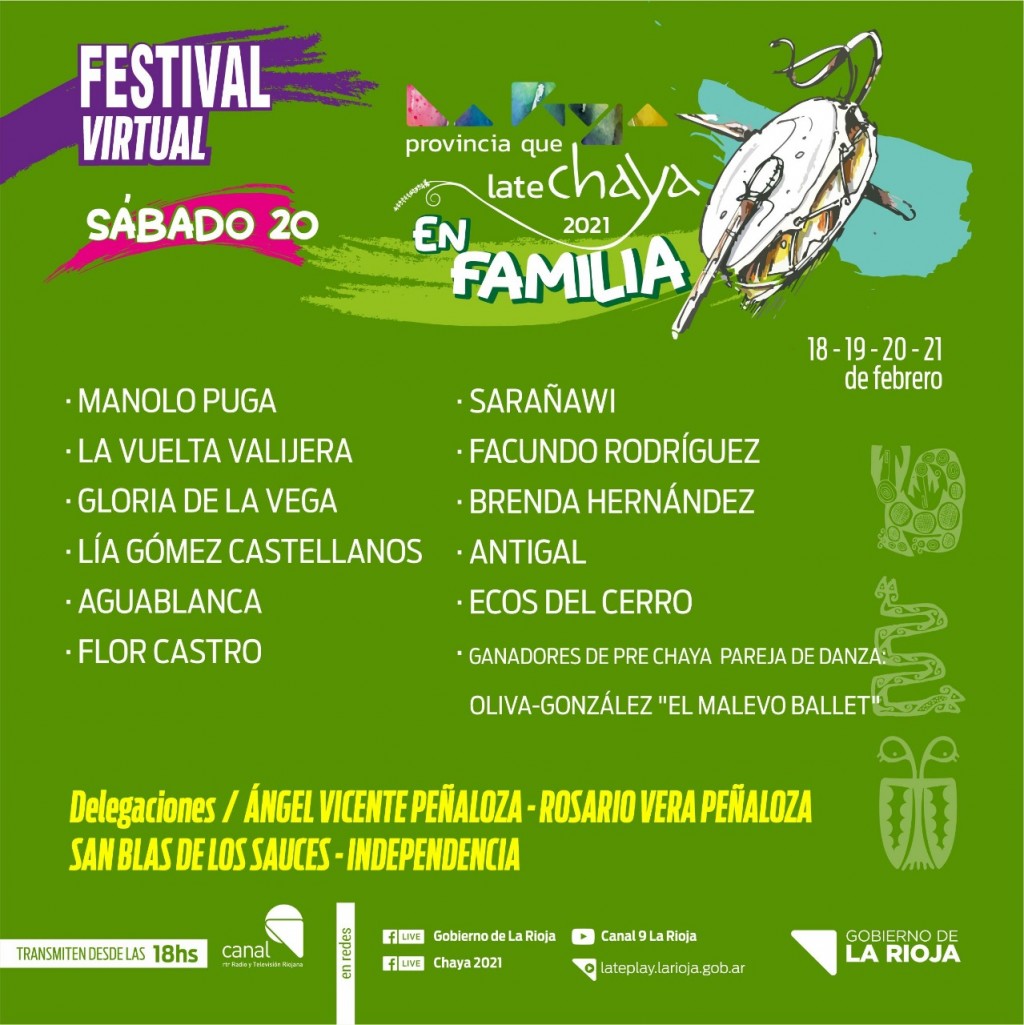 Este sábado 20 de febrero, desde las 18 horas comenzará la transmisión del tercer día del festival #ChayaEnFamilia, esta vez, en homenaje a Manolo Puga, por Canal 9 y Facebook Live en Gobierno de La Rioja y Chaya 2021.