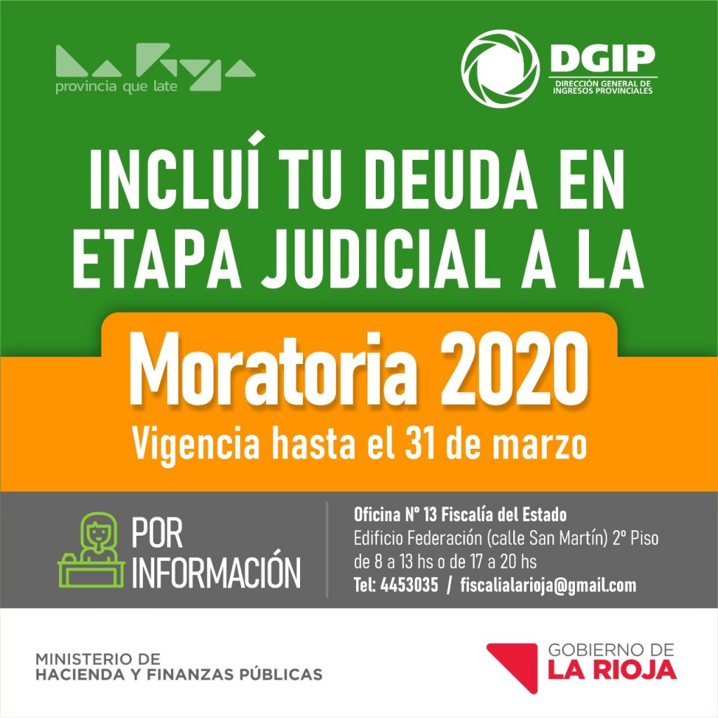 El Ministerio de Hacienda y Finanzas Públicas a través de la Dirección de Ingresos Provinciales, recuerda a los contribuyentes que pueden incluir sus deudas que se encuentran en etapa judicial, a la Moratoria 2020, dicho beneficio tiene vigencia hasta el 31 de marzo del corriente año.