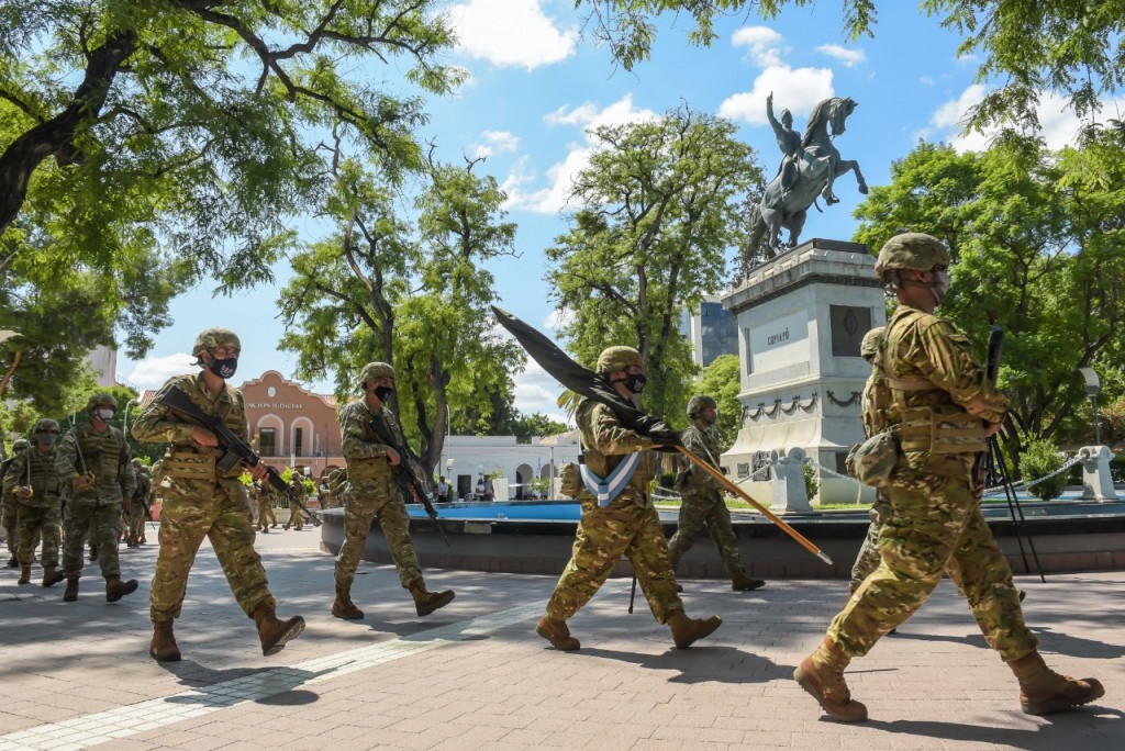 Seguidamente, acompañó la Banda de música del Regimiento de Infantería de Montaña 15, entonando las estrofas del himno Nacional Argentino y el himno de la provincia de La Rioja. Posteriormente, el Presbítero de la Guarnición, padre Jorge Pérez, realizó una invocación religiosa. Acto seguido, se hizo entrega de ofrendas florales al pie del monumento del padre de la Patria.