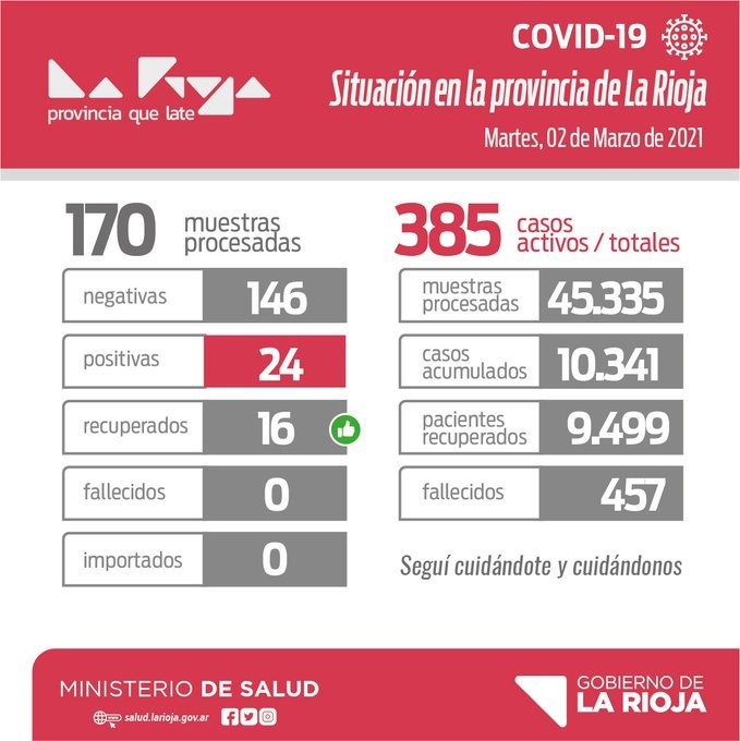 El Ministerio de Salud de la provincia informó que este martes se procesaron 170 muestras, de las cuales 146 son negativas y 24 positivas para COVID-19. Se trata de 10 mujeres y 14 hombres.