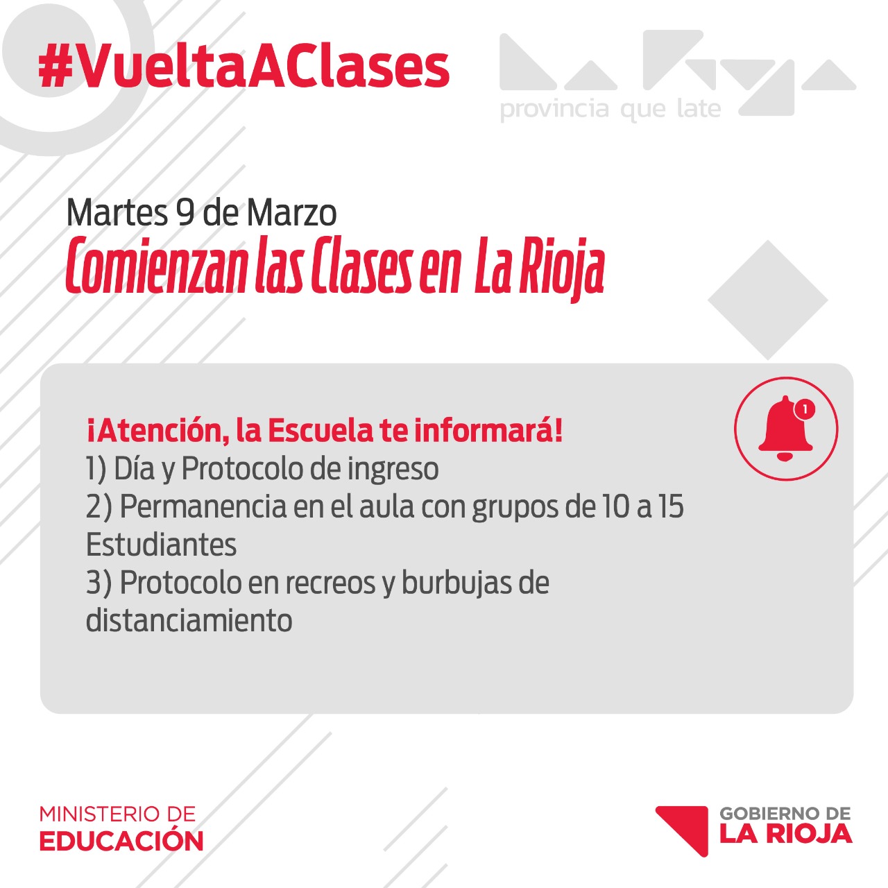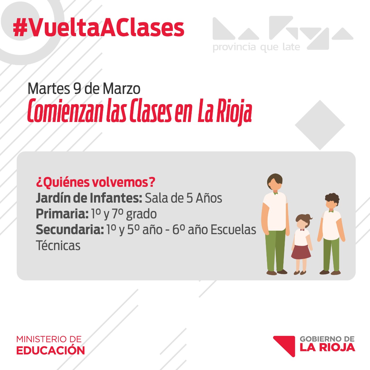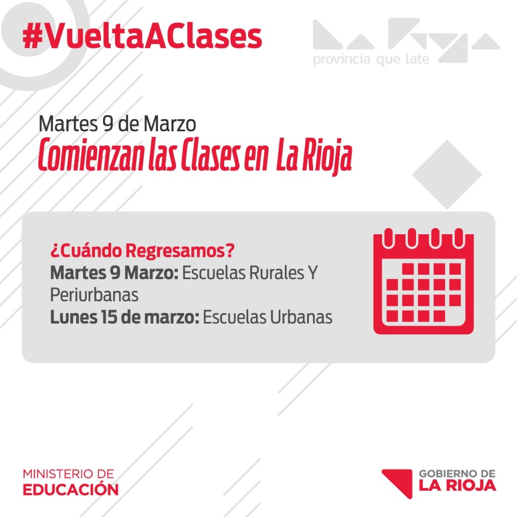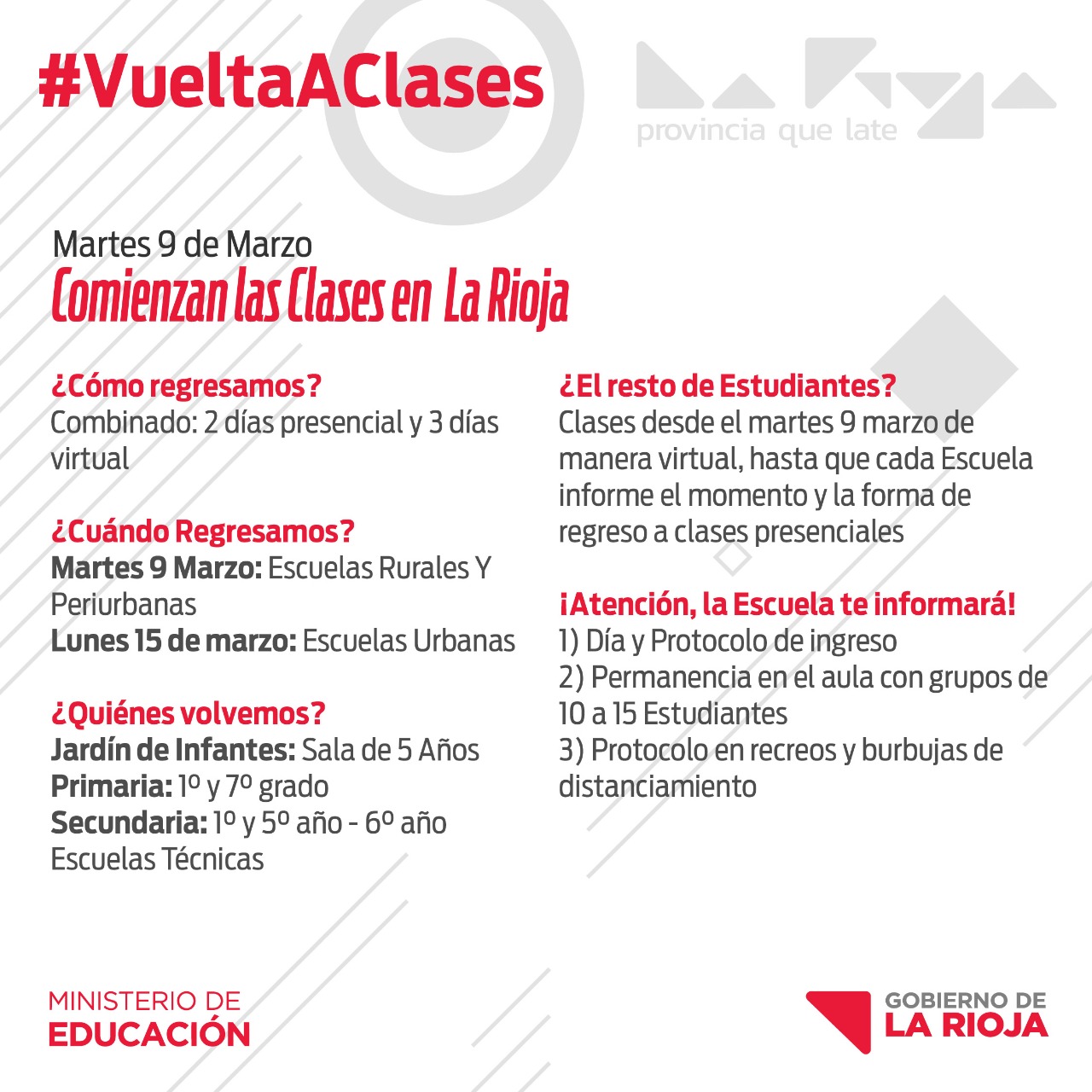En virtud de conmemorarse el Dia Internacional de la Mujer, el ministerio de Educación de La Rioja dispuso que el retorno a la presencialidad será el 9 de marzo. El proceso se iniciará en las escuelas rurales y periurbanas, mientras que desde el 15 de marzo se sumarán las que se encuentren en las zonas urbanas. En todos los casos, los establecimientos dispondrán del correspondiente protocolo.