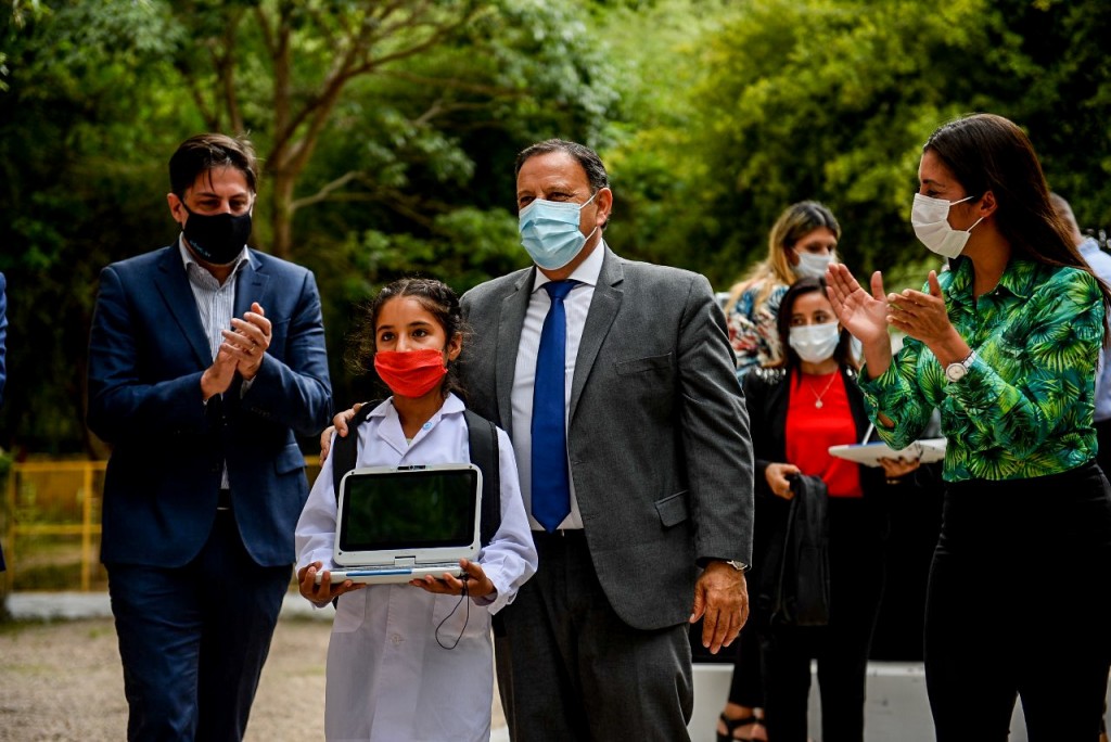 El gobernador Ricardo Quintela junto al ministro de Educación de la Nación, Nicolás Trotta dejaron inaugurado hoy el ciclo lectivo 2021 y el acto tuvo lugar en la Escuela Nº 164 Juana Loreto de Argüello en Puerta de La Quebrada. En la oportunidad, también se realizó el lanzamiento del programa Rosario Vera Peñaloza, por el cual la provincia entregará 20 mil computadoras a alumnos del nivel primario.