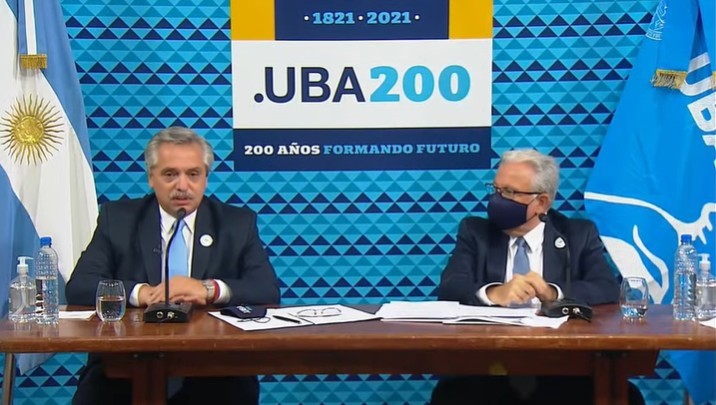 El presidente, Alberto Fernández, encabezó este viernes un acto en el edificio histórico de Manzana de las Luces donde se dio por iniciado oficialmente el Año del Bicentenario de la Universidad de Buenos Aires ( UBA).