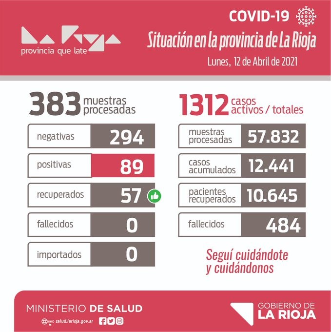 El ministerio de Salud de la provincia informo en su parte diario que se procesaron 383 muestras, de las cuales 294 son negativas y 89 positivas para COVID-19. Se trata de 28 mujeres y 61 hombres.