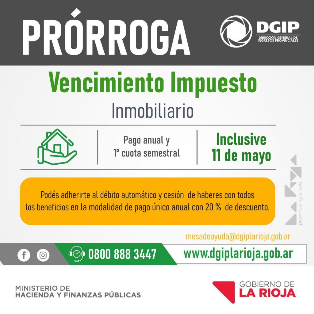 El Ministerio de Hacienda y Finanzas Pública a través de la Dirección de Ingresos Provinciales comunica la Prórroga del Vencimiento del Impuesto Inmobiliario, en la modalidad de pago único anual con 20 % de descuento y 1° cuota semestral con el 10% de descuento, hasta el día martes 11 de mayo de 2021, inclusive.