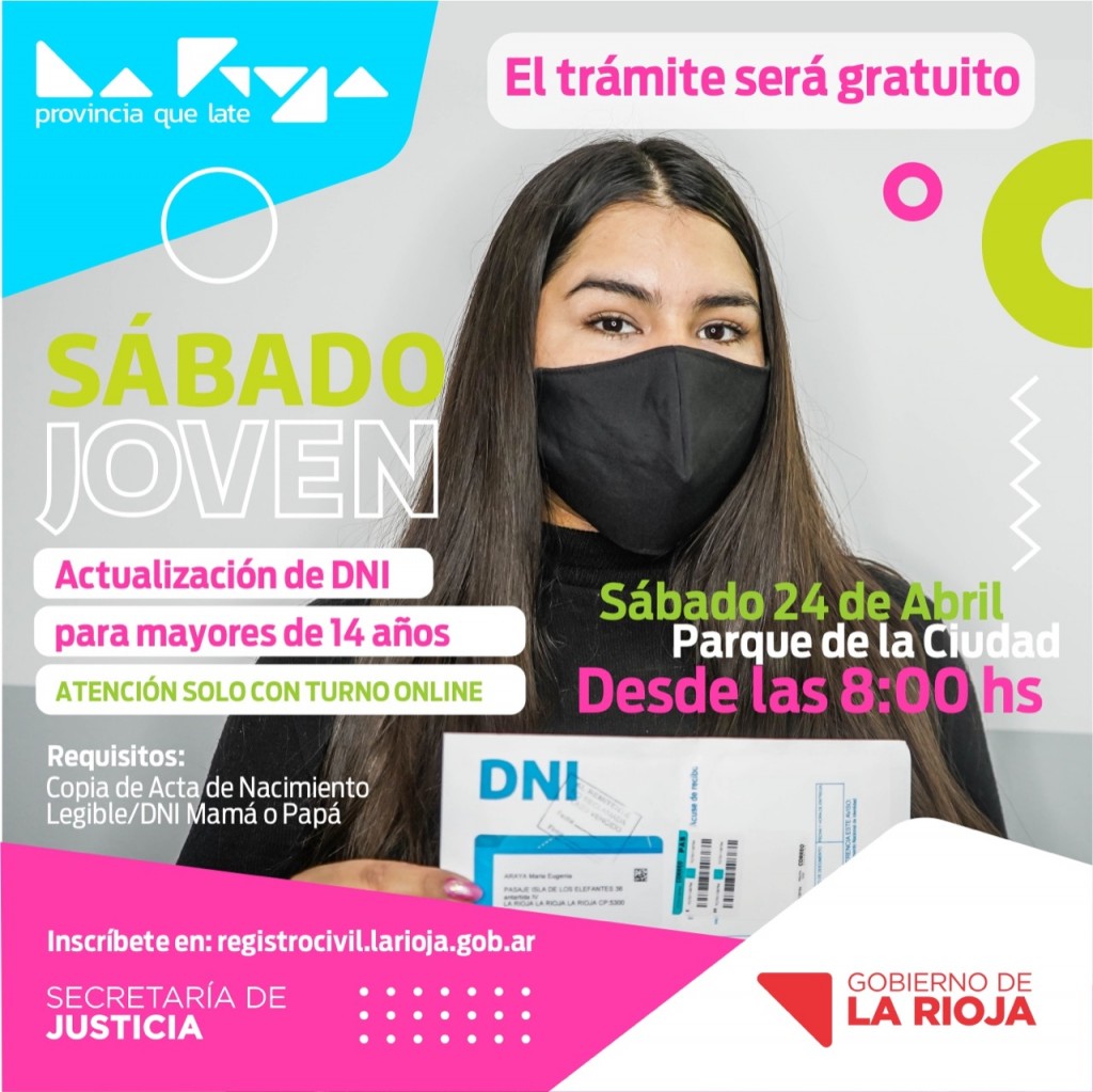 Este sábado 24 de abril, el Registro Civil provincial, atenderá a los y las jóvenes en el Parque de la Ciudad en el horario de 8:00 a 18:00 horas, previa inscripción a través de la Página Web: registrocivil.larioja.gob.ar. En razón de la demanda, también se atenderá el domingo 25 en los mismos horarios.