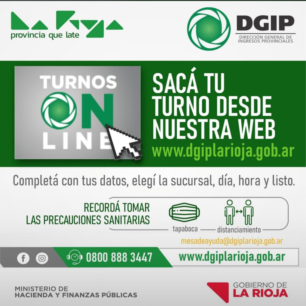 El Ministerio de Hacienda, a través de la Dirección General de Ingresos Provinciales (DGIP), comunica que en virtud de las medidas adoptadas por el Gobierno Provincial, solo por este miércoles 26, jueves 27 y viernes 28 la atención al contribuyente será de 8 a 13 horas para lo cual deberán solicitar su turno online desde la página web www.dgiplarioja.gob.ar.
