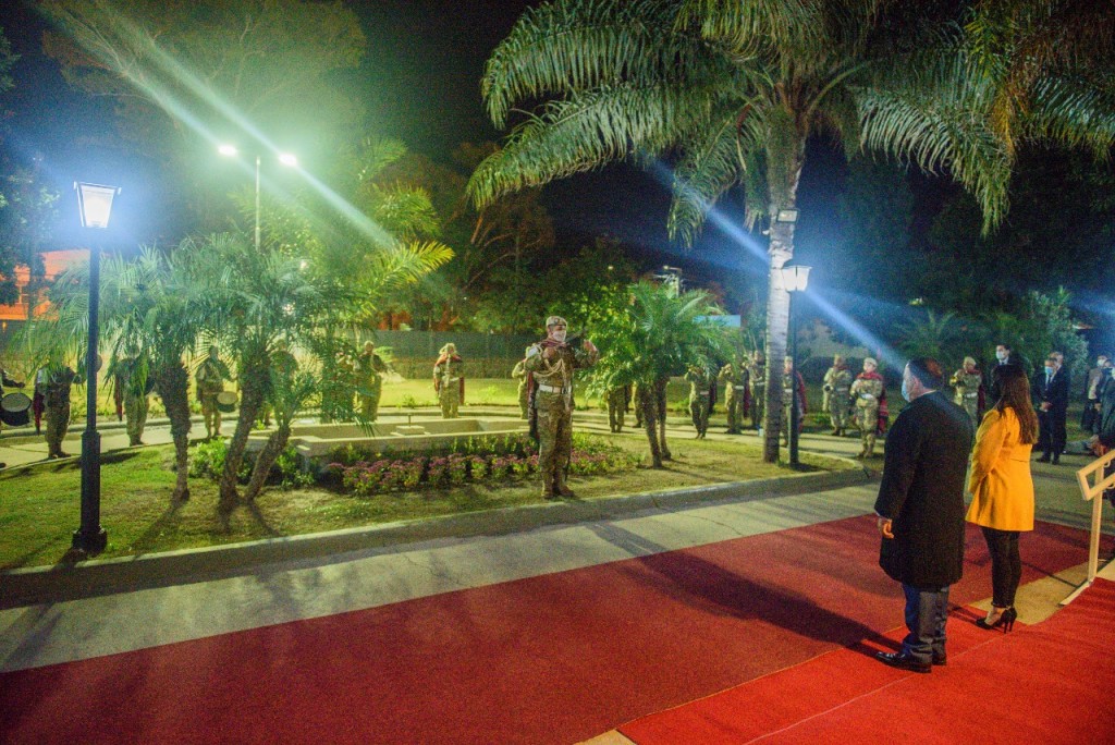 Para finalizar, el gobernador Quintela en compañía de Florencia López y el presidente del Tribunal Superior de Justicia, Luis Brizuela, procedió a realizar la ofrenda floral en el monumento en honor al General San Martín.