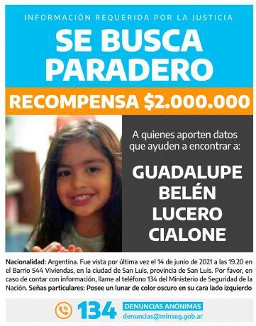 El Gobierno nacional ofreció una recompensa de 2 millones de pesos para quienes aporten "información útil" que permita hallar a Guadalupe, una medida publicada este viernes en el Boletín Oficial a pedido del titular del juzgado penal Nº 2 de San Luis, Ariel Parrillis, que tiene la causa por su desaparición, y se canalizó a través del programa federal de búsqueda de personas y el "Alerta Sofía".