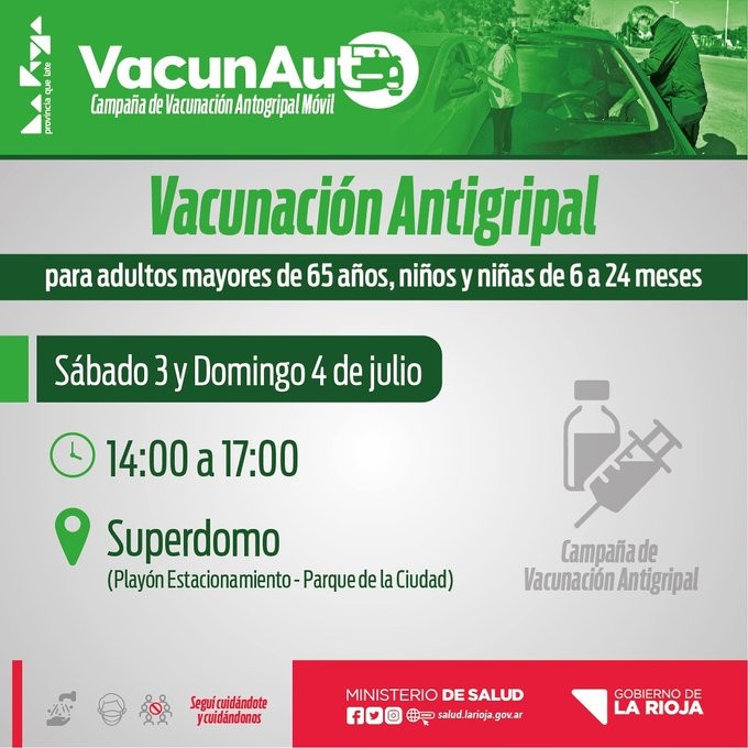 El gobierno de la provincia informa que este sábado 3 y domingo 4 de julio, se vacunará contra la gripe a niños y niñas de 6 a 24 meses y para personas mayores de 65 años de edad. La actividad se realizará en el Estadio Superdomo con la modalidad vacunauto, en los horarios de 14 a 17 horas.