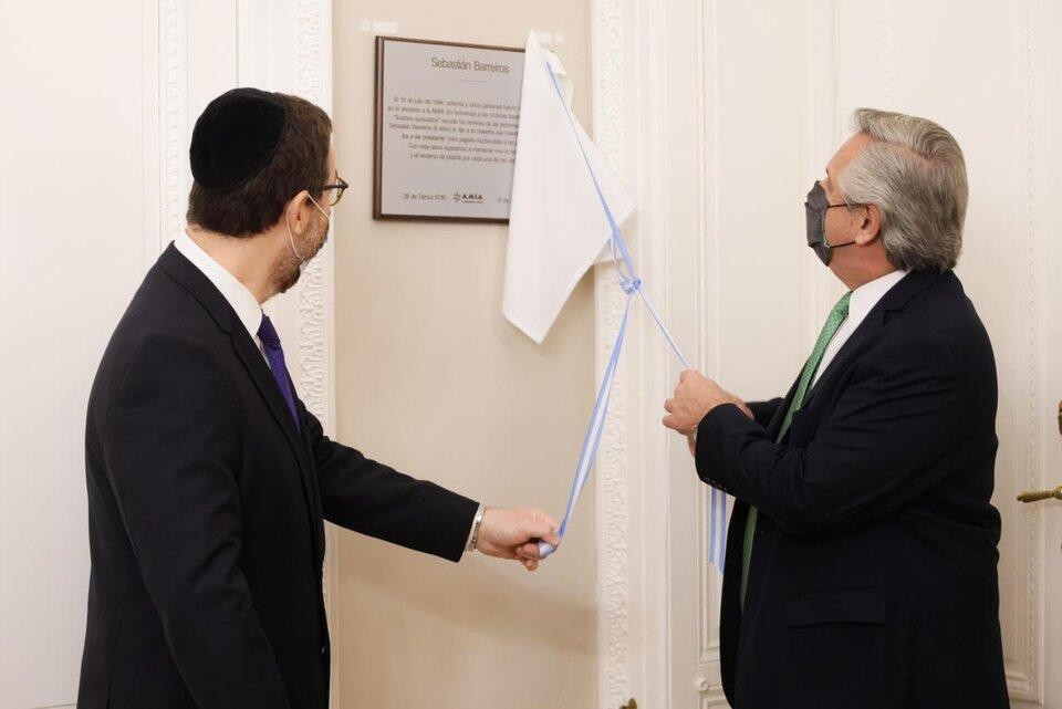 Durante el encuentro, se descubrió una placa que forma parte de un proyecto para recordar a las 85 personas asesinadas en el atentado y que, en este caso, recuerda a Sebastián Barreiros con un texto.