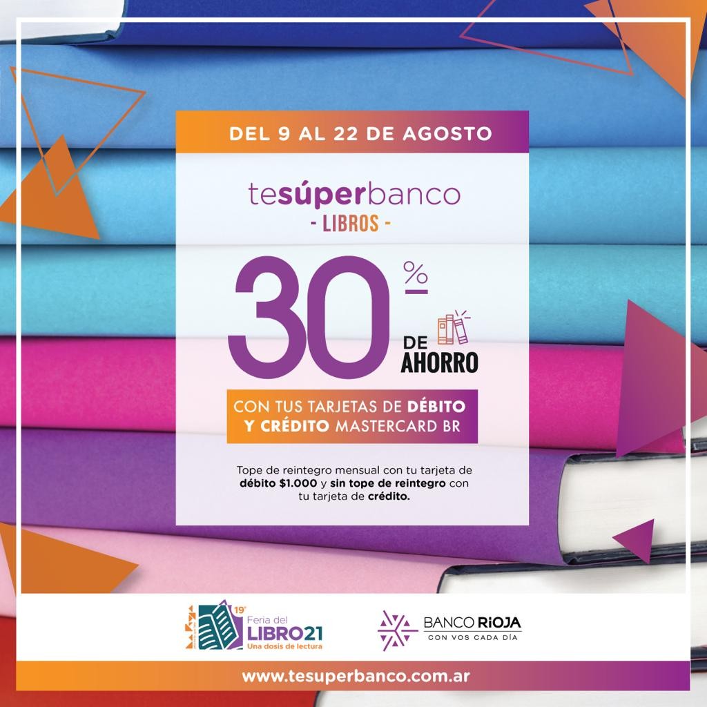 Para acompañar la tradicional feria, desde hoy entra en vigencia la promoción bancaria te súper banco Libros. Hasta el 22 de agosto inclusive se podrá acceder a un 30% de ahorro en librerías adheridas pagando con tarjeta de débito BR o tarjeta de crédito Mastercard de la entidad riojana.  Además, se ofrece hasta 12 cuotas sin interés. Para acceder a mayor información, se deberá ingresar a:  https://www.tesuperbanco.com.ar
