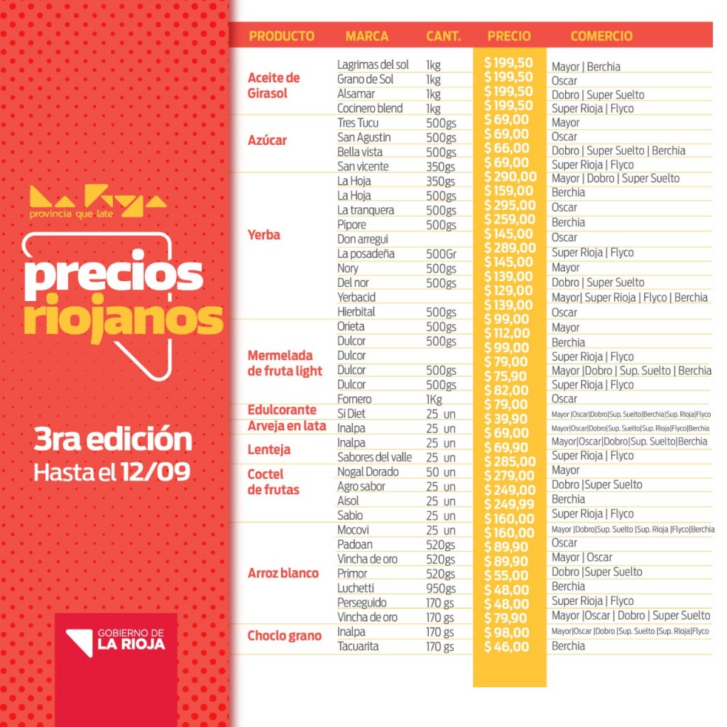 La iniciativa incluye alimentos de almacén de diversas marcas y carne de pollo, como así también diferentes opciones de alcohol en gel y de repelentes de insectos. Estos productos se encontrarán disponibles, a precio final, único y constante, en las sucursales de los supermercados “Mayor”, “Dobro”, “Flyco”; “Oscar”, “Super Rioja”, “Super Suelto”, “Casa Berchia”, en Granja “Los Pollos”; “Los Granjeros” y en “Granjas Riojanas”.