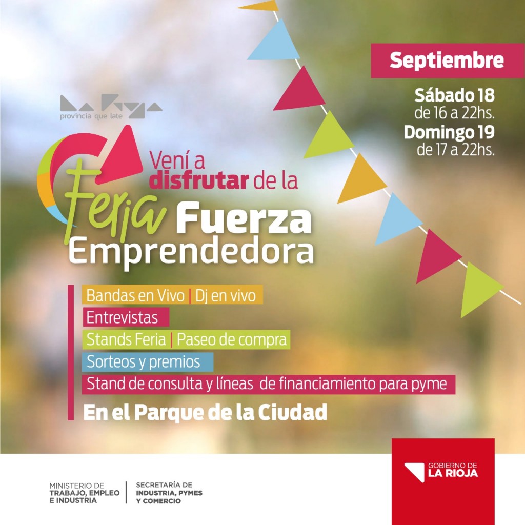 El Gobierno de la Provincia llevará a cabo este sábado 18 y domingo 19 de septiembre, por la tarde, la feria “Fuerza Emprendedora” en el Parque de la Ciudad. Durante las dos jornadas se podrá disfrutar, en familia o con amigos, de música en vivo, sorteos, entrevistas, stands de compras y exposiciones de arte.
