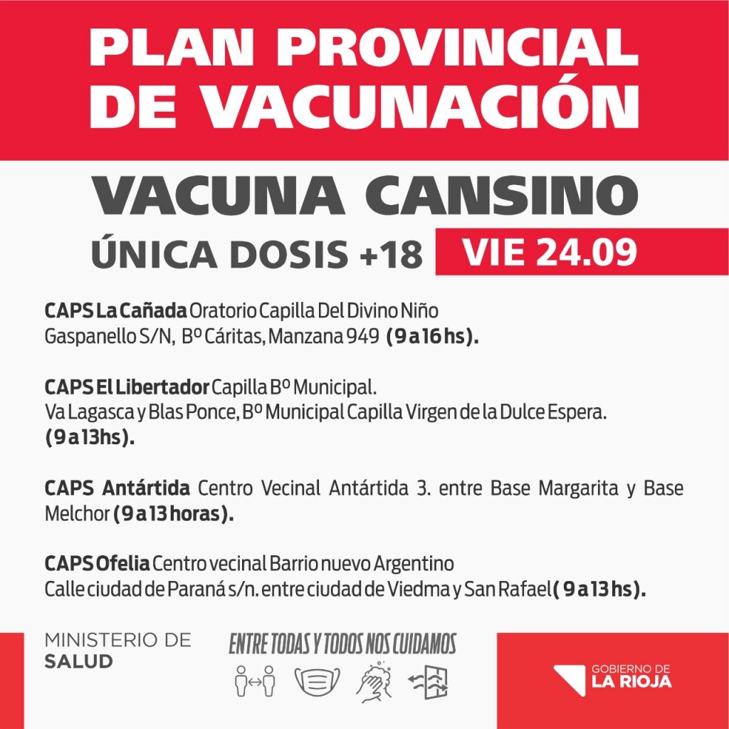 La secretaria de Promoción y Prevención de la Salud, explicó que este viernes se realizará una jornada de vacunación libre contra el covid, con la vacuna CanSino de monodosis (una sola dosis). La vacuna está destinada a mayores de 18 años, para lo cual la provincia ha recibido aproximadamente 4 mil dosis.